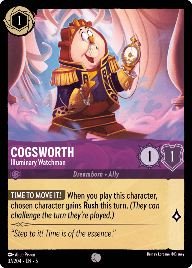 When you play this character, chosen character gains Rush this turn. (They can challenge the turn they're played.)