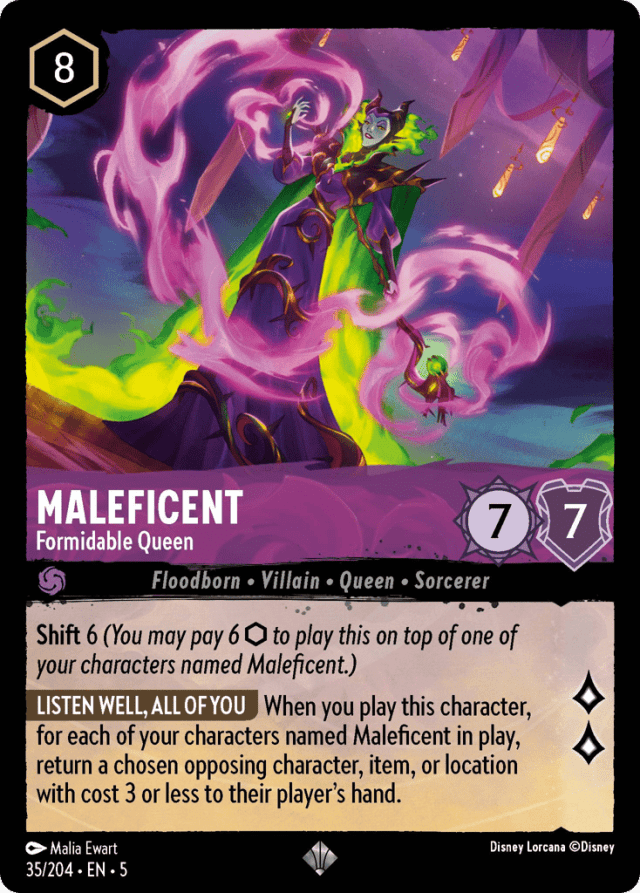 When you play this character, for each of your characters named Maleficent in play, return a chosen opposing character, item, or location with cost 3 or less to their player's hand.