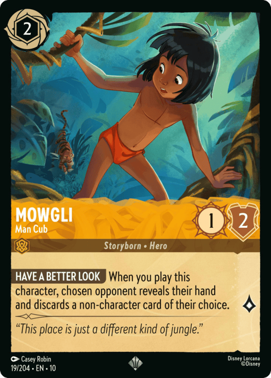 When you play this character, chosen opponent reveals their hand and discards a non-character card of their choice.