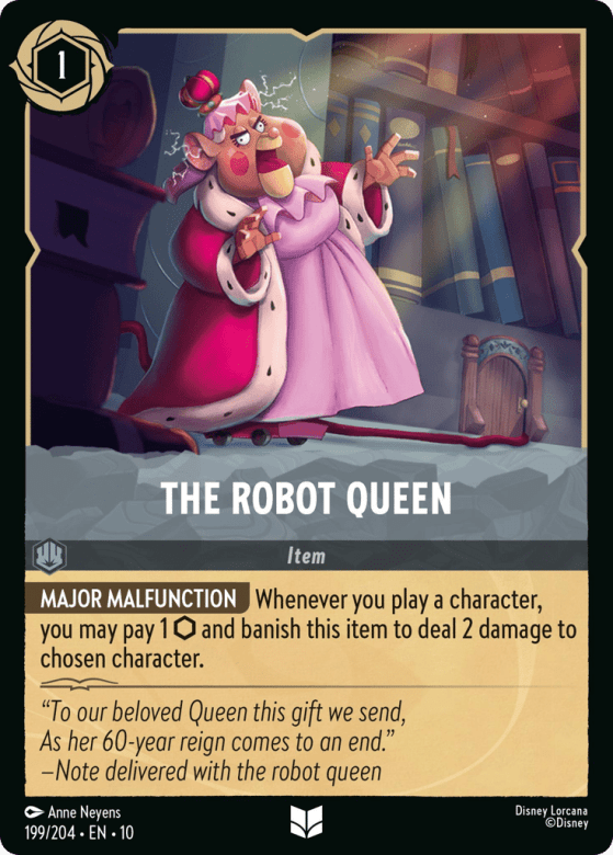 Whenever you play a character, you may pay 1 {Ink} and banish this item to deal 2 damage to chosen character.