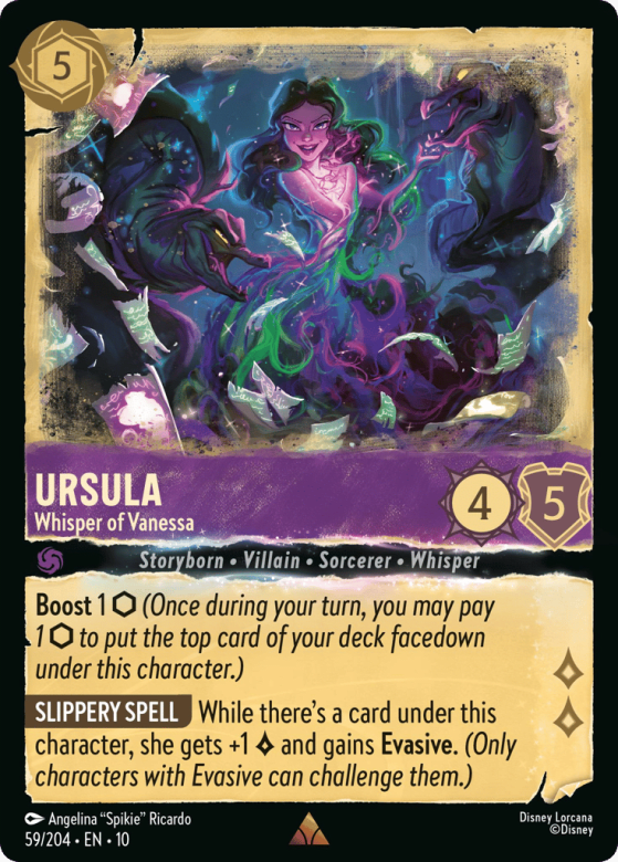 While there's a card under this character, she gets +1 {Lore} and gains Evasive. (Only characters with Evasive can challenge them.)