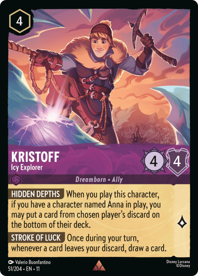 When you play this character, if you have a character named Anna in play, you may put a card from chosen player's discard on the bottom of their deck.