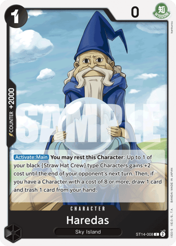 [Blocker] (After your opponent declares an attack, you may rest this card to make it the new target of the attack.) [On Play] If you have 6 or less cards in your hand and a Character with a cost of 8 or more, draw 1 card.