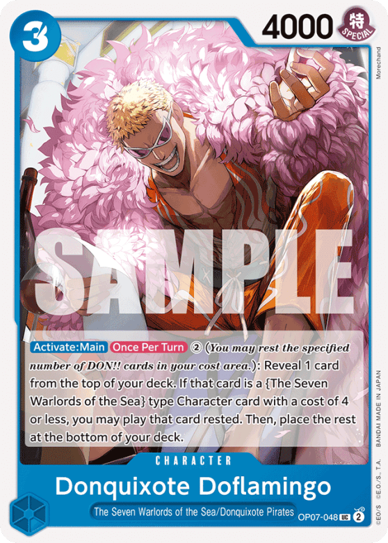 [Activate: Main] [Once Per Turn] ➁ (You may rest the specified number of DON!! cards in your cost area.): Reveal 1 card from the top of your deck. If that card is a {The Seven Warlords of the Sea} type Character card with a cost of 4 or less, you may play that card rested. Then, place the rest at the bottom of your deck.
