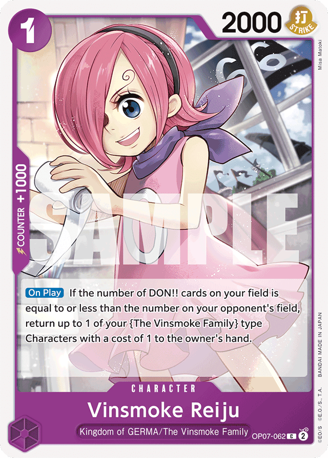[On Play] If the number of DON!! cards on your field is equal to or less than the number on your opponent's field, return up to 1 of your {The Vinsmoke Family} type Characters with a cost of 1 to the owner's hand.