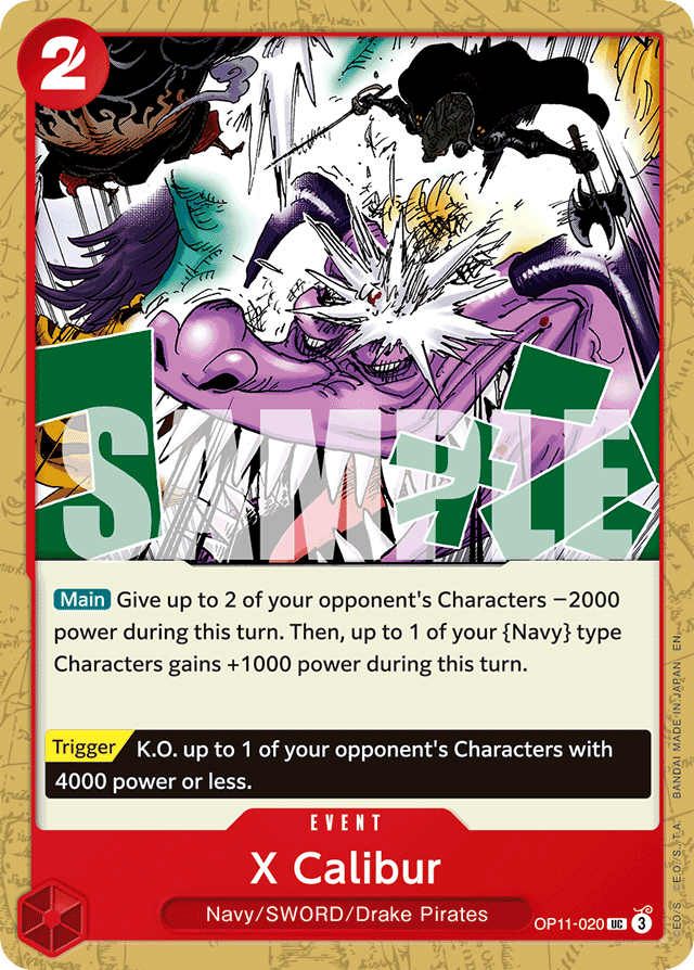 [Main] Give up to 2 of your opponent's Characters −2000 power during this turn. Then, up to 1 of your {Navy} type Characters gains +1000 power during this turn. [Trigger] K.O. up to 1 of your opponent's Characters with 4000 power or less.