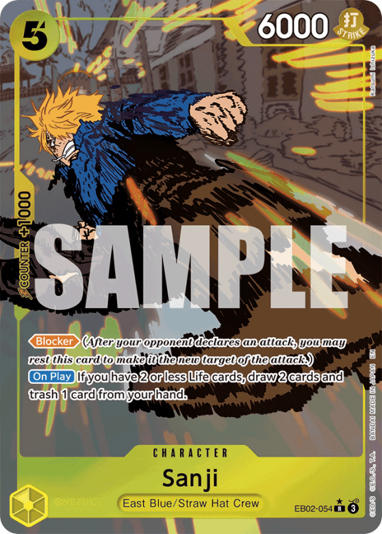 [Blocker] (After your opponent declares an attack, you may rest this card to make it the new target of the attack.) [On Play] If you have 2 or less Life cards, draw 2 cards and trash 1 card from your hand.