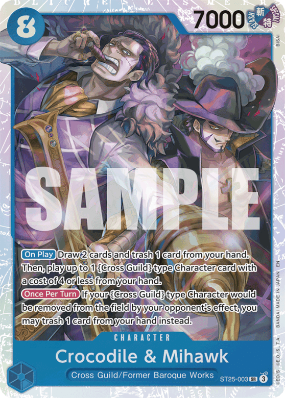 [On Play] Draw 2 cards and trash 1 card from your hand. Then, play up to 1 {Cross Guild} type Character card with a cost of 4 or less from your hand. [Once Per Turn] If your {Cross Guild} type Character would be removed from the field by your opponent's effect, you may trash 1 card from your hand instead.