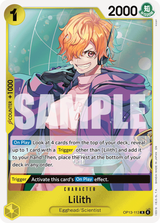 [On Play] Look at 4 cards from the top of your deck; reveal up to 1 card with a [Trigger] other than [Lilith] and add it to your hand. Then, place the rest at the bottom of your deck in any order. [Trigger] Activate this card's [On Play] effect.