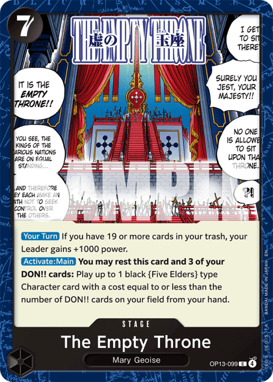 [Your Turn] If you have 19 or more cards in your trash, your Leader gains +1000 power. [Activate: Main] You may rest this card and 3 of your DON!! cards: Play up to 1 black {Five Elders} type Character card with a cost equal to or less than the number of DON!! cards on your field from your hand.