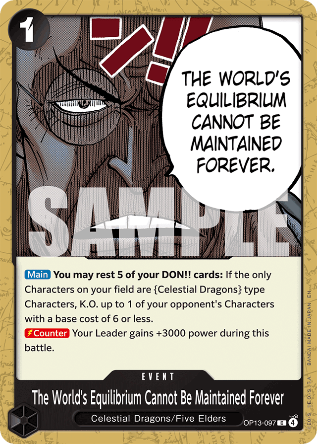 [Main] You may rest 5 of your DON!! cards: If the only Characters on your field are {Celestial Dragons} type Characters, K.O. up to 1 of your opponent's Characters with a base cost of 6 or less. [Counter] Your Leader gains +3000 power during this battle.