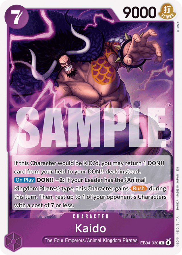 If this Character would be K.O.'d, you may return 1 DON!! card from your field to your DON!! deck instead. [On Play] DON!! −2: If your Leader has the {Animal Kingdom Pirates} type, this Character gains [Rush] during this turn. Then, rest up to 1 of your opponent's Characters with a cost of 7 or less.