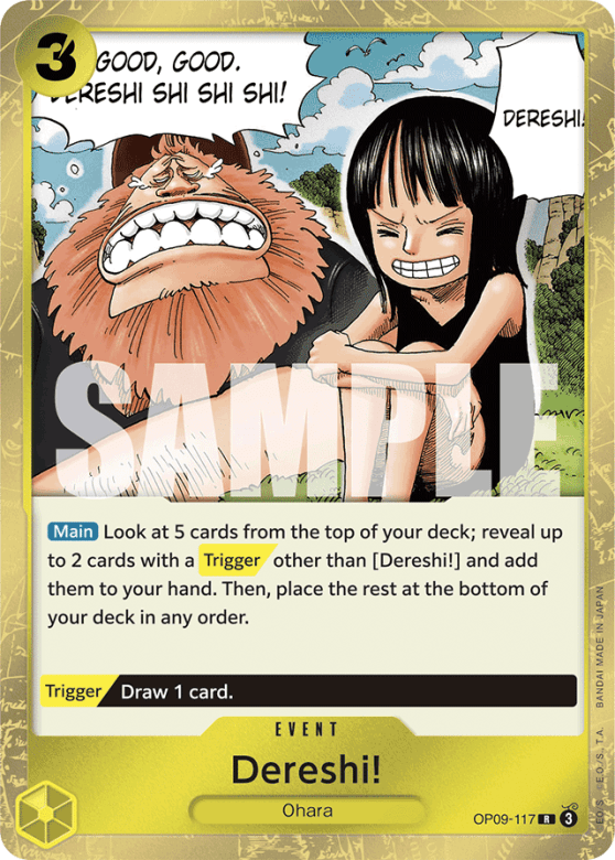 [Main] Look at 5 cards from the top of your deck; reveal up to 2 cards with a [Trigger] other than [Dereshi!] and add them to your hand. Then, place the rest at the bottom of your deck in any order. [Trigger] Draw 1 card.