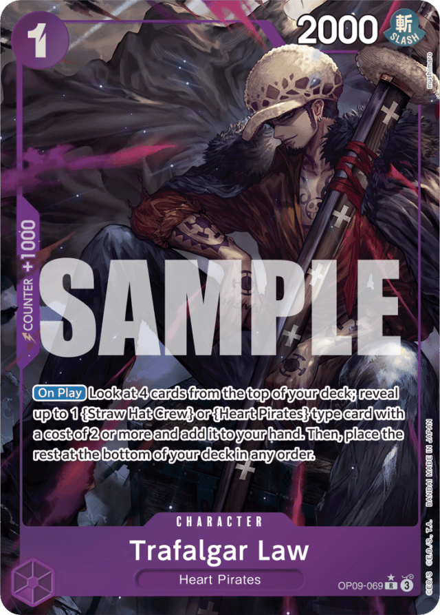 [On Play] Look at 4 cards from the top of your deck; reveal up to 1 {Straw Hat Crew} or {Heart Pirates} type card with a cost of 2 or more and add it to your hand. Then, place the rest at the bottom of your deck in any order.