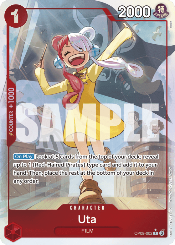 [On Play] Look at 5 cards from the top of your deck; reveal up to 1 {Red-Haired Pirates} type card and add it to your hand. Then, place the rest at the bottom of your deck in any order.