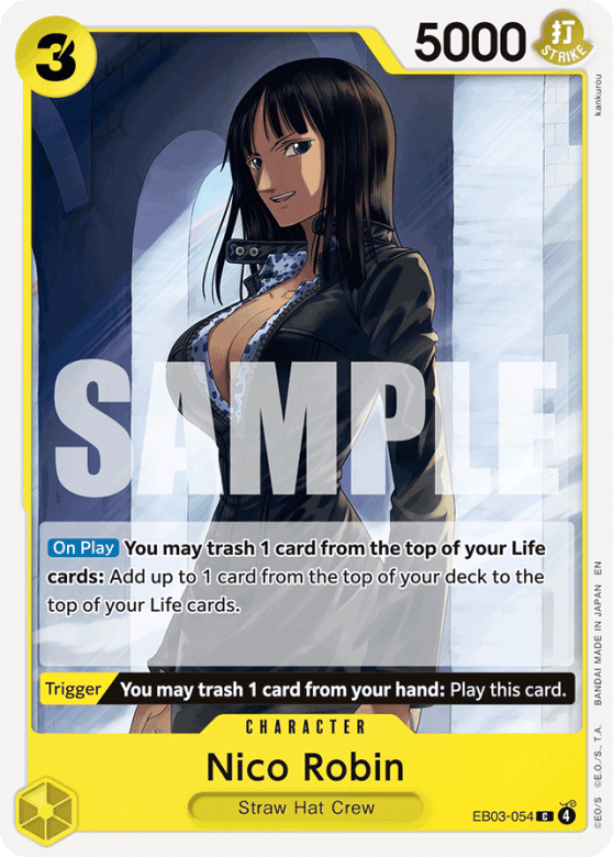 [On Play] You may trash 1 card from the top of your Life cards: Add up to 1 card from the top of your deck to the top of your Life cards. [Trigger] You may trash 1 card from your hand: Play this card.