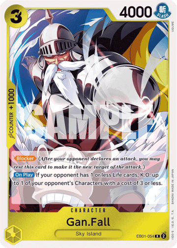[Main] K.O. up to 1 of your opponent's Characters. Then, trash cards from the top of your Life cards until you have 1 Life card. [Trigger] K.O. up to 1 of your opponent's Characters with a cost equal to or less than the total of your and your opponent's Life cards.