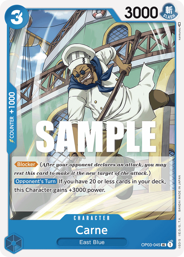 [Blocker] (After your opponent declares an attack, you may rest this card to make it the new target of the attack.) [Opponent's Turn] If you have 20 or less cards in your deck, this Character gains +3000 power.