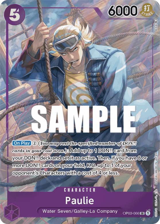 [On Play] ➁ (You may rest the specified number of DON!! cards in your cost area.): Add up to 1 DON!! card from your DON!! deck and set it as active. Then, if you have 8 or more DON!! cards on your field, K.O. up to 1 of your opponent's Characters with a cost of 4 or less.