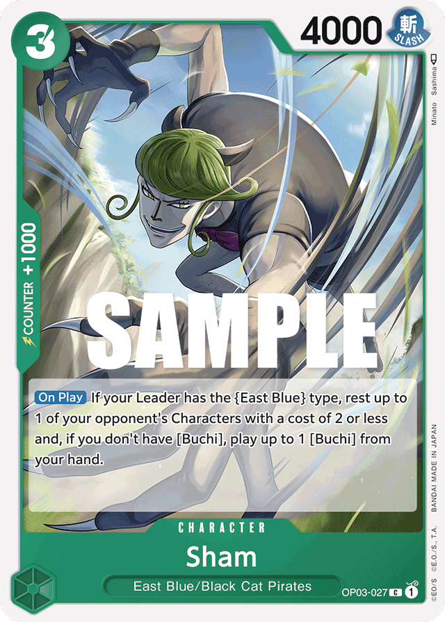 [On Play] If your Leader has the {East Blue} type, rest up to 1 of your opponent's Characters with a cost of 2 or less and, if you don't have [Buchi], play up to 1 [Buchi] from your hand.