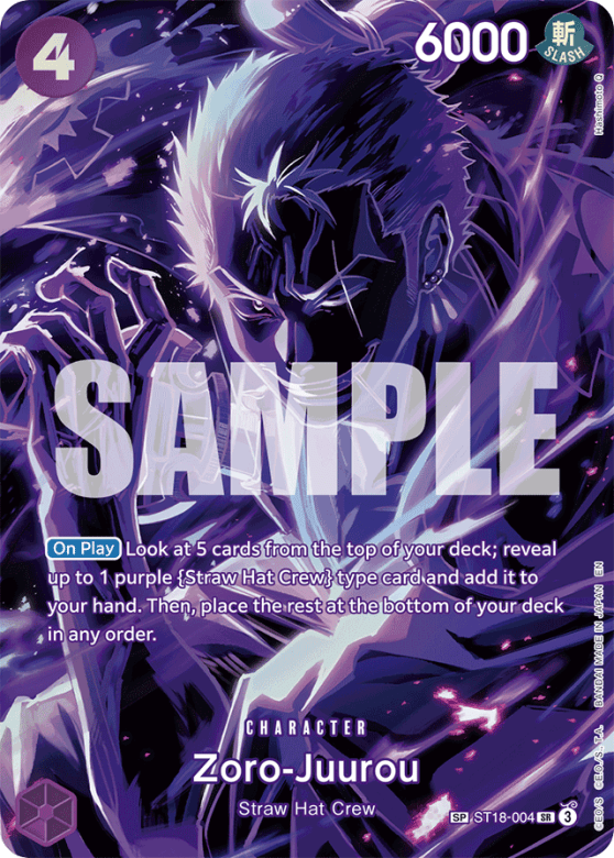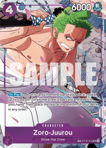 [On Play] Look at 5 cards from the top of your deck; reveal up to 1 purple {Straw Hat Crew} type card and add it to your hand. Then, place the rest at the bottom of your deck in any order.
