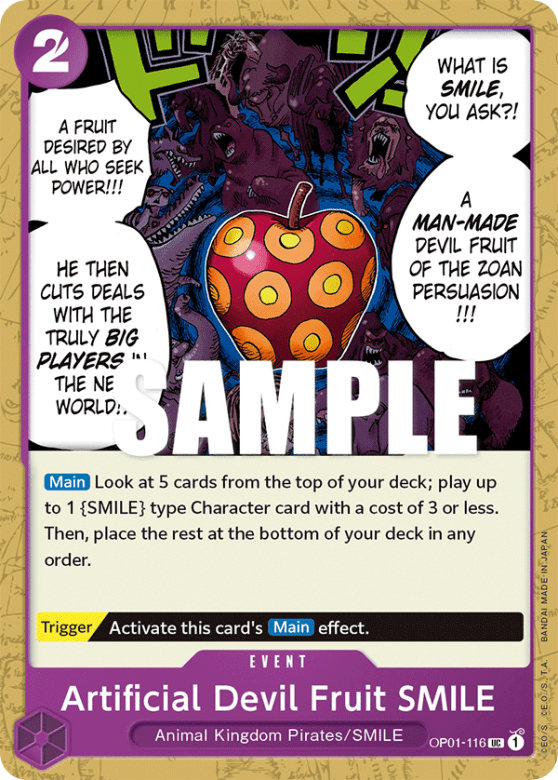 [Main] Look at 5 cards from the top of your deck; play up to 1 {SMILE} type Character card with a cost of 3 or less. Then, place the rest at the bottom of your deck in any order. [Trigger] Activate this card's [Main] effect.