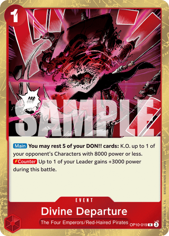 [Main] You may rest 5 of your DON!! cards: K.O. up to 1 of your opponent's Characters with 8000 power or less. [Counter] Up to 1 of your Leader gains +3000 power during this battle.