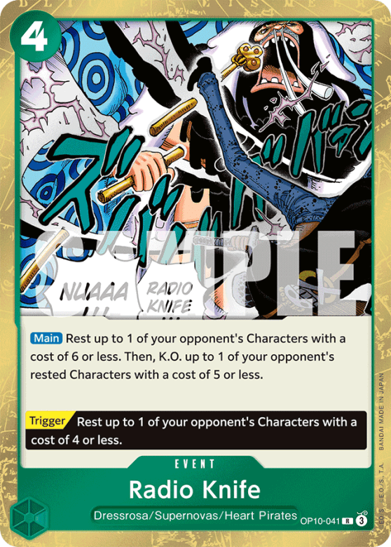 [Main] Rest up to 1 of your opponent's Characters with a cost of 6 or less. Then, K.O. up to 1 of your opponent's rested Characters with a cost of 5 or less. [Trigger] Rest up to 1 of your opponent's Characters with a cost of 4 or less.