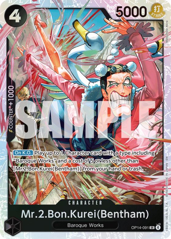 [On K.O.] Play up to 1 Character card with a type including "Baroque Works" and a cost of 5 or less other than [Mr.2.Bon.Kurei(Bentham)] from your hand or trash.