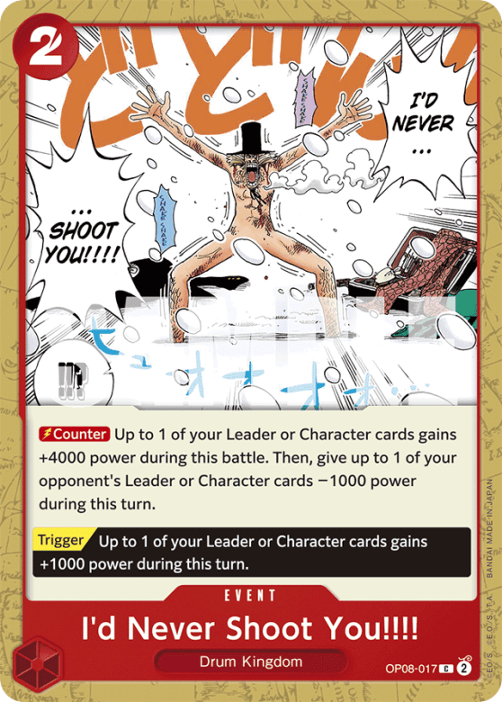 [Counter] Up to 1 of your Leader or Character cards gains +4000 power during this battle. Then, give up to 1 of your opponent's Leader or Character cards −1000 power during this turn. [Trigger] Up to 1 of your Leader or Character cards gains +1000 power during this turn.