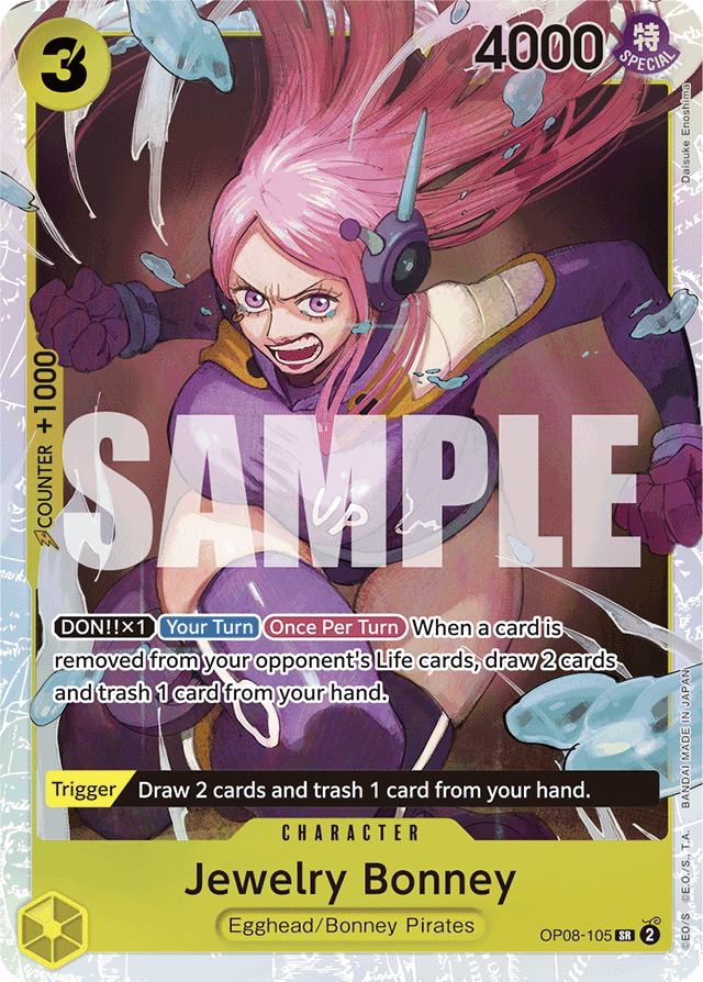 [DON!! x1] [Your Turn] [Once Per Turn] When a card is removed from your opponent's Life cards, draw 2 cards and trash 1 card from your hand. [Trigger] Draw 2 cards and trash 1 card from your hand.