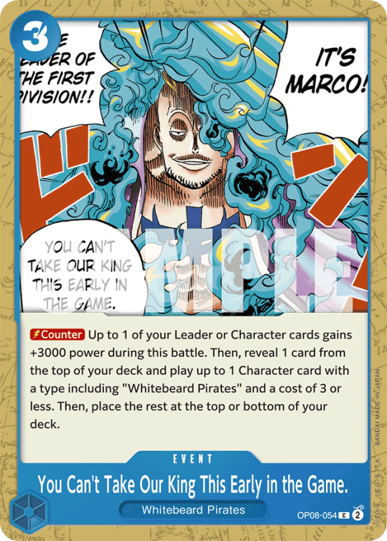 [Counter] Up to 1 of your Leader or Character cards gains +3000 power during this battle. Then, reveal 1 card from the top of your deck and play up to 1 Character card with a type including "Whitebeard Pirates" and a cost of 3 or less. Then, place the rest at the top or bottom of your deck.