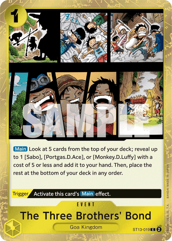 [Main] Look at 5 cards from the top of your deck; reveal up to 1 [Sabo], [Portgas.D.Ace], or [Monkey.D.Luffy] with a cost of 5 or less and add it to your hand. Then, place the rest at the bottom of your deck in any order. [Trigger] Activate this card's [Main] effect.