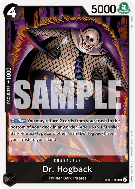 [On Play] You may return 2 cards from your trash to the bottom of your deck in any order: Add up to 1 {Thriller Bark Pirates} type card other than [Dr. Hogback] from your trash to your hand.
