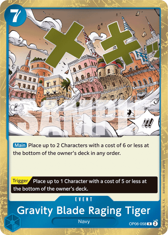[Main] Place up to 2 Characters with a cost of 6 or less at the bottom of the owner's deck in any order. [Trigger] Place up to 1 Character with a cost of 5 or less at the bottom of the owner's deck.