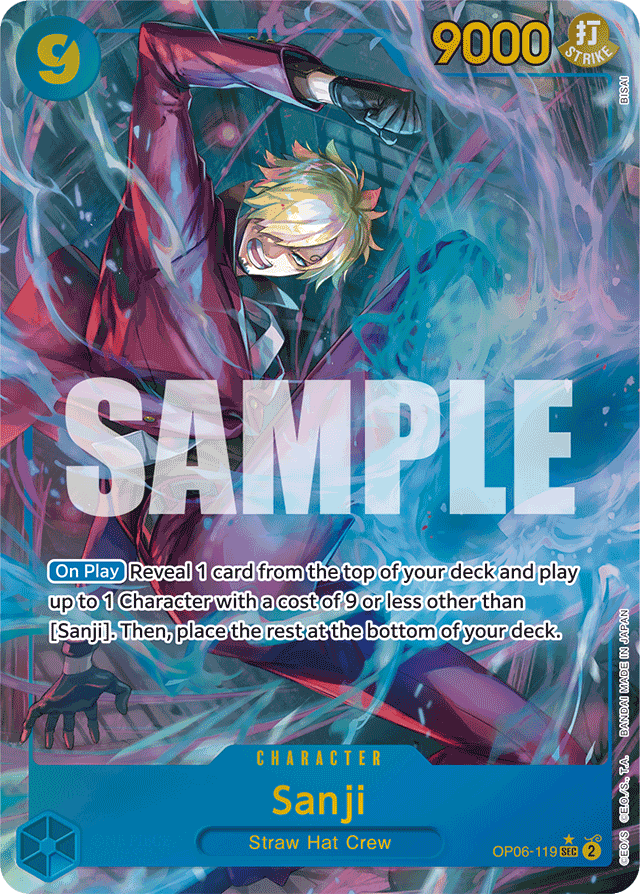 [On Play] Reveal 1 card from the top of your deck and play up to 1 Character with a cost of 9 or less other than [Sanji]. Then, place the rest at the bottom of your deck.