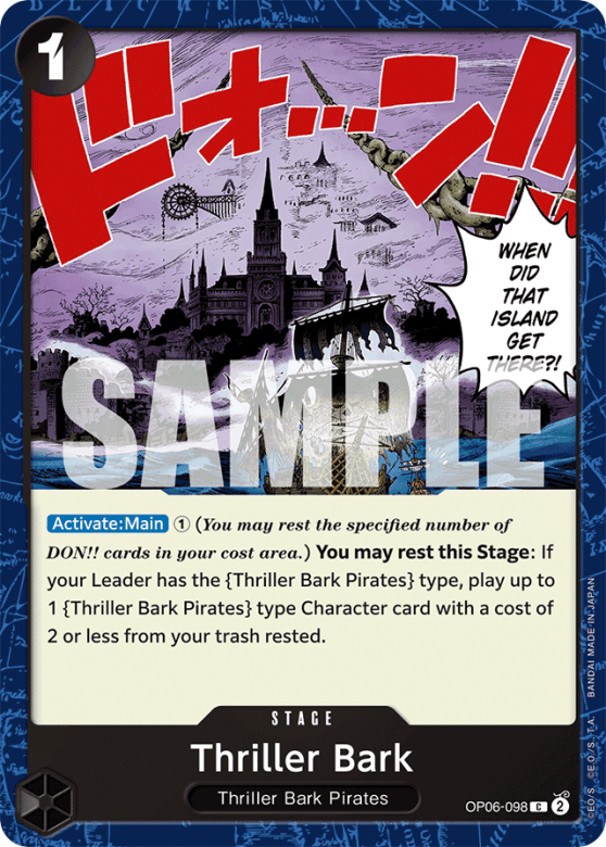 [Activate: Main] ➀ (You may rest the specified number of DON!! cards in your cost area.) You may rest this Stage: If your Leader has the {Thriller Bark Pirates} type, play up to 1 {Thriller Bark Pirates} type Character card with a cost of 2 or less from your trash rested.
