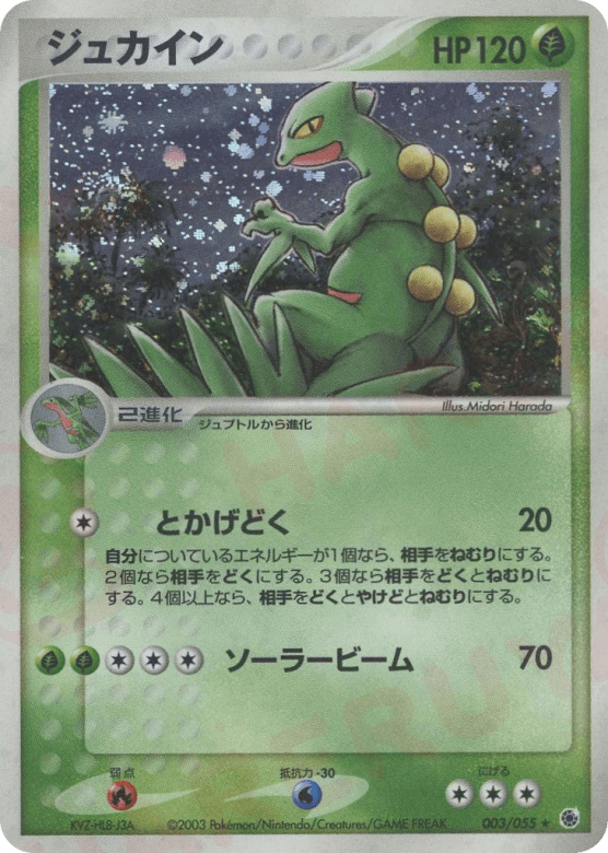 If 1 Energy is attached to Sceptile, the Defending Pokémon is now Asleep. If 2 Energy is attached to Sceptile, the Defending Pokémon is now Poisoned. If 3 Energy is attached to Sceptile, the Defending Pokémon is now Asleep and Poisoned. If 4 or more Energy is attached to Sceptile, the Defending Pokémon is now Asleep, Burned, and Poisoned.
