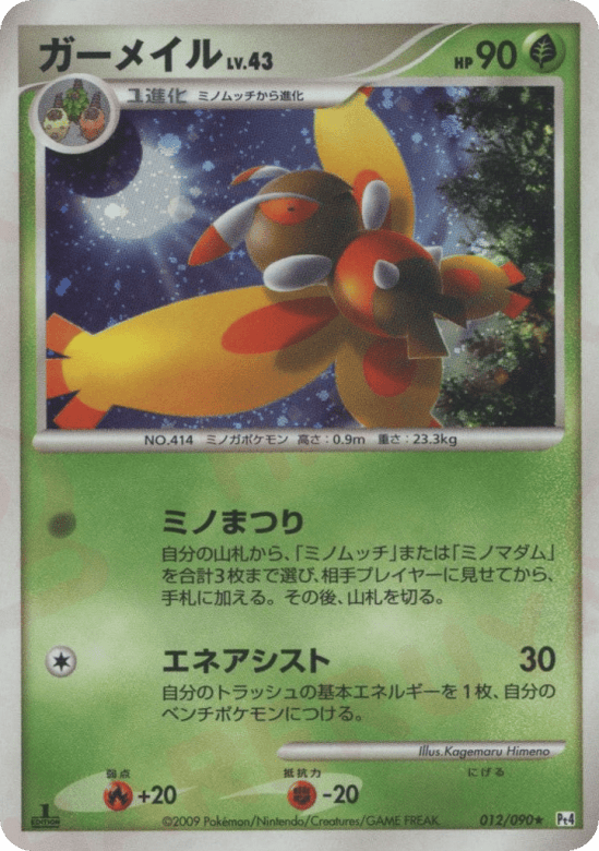 自分の山札から、「ミノムッチ」または「ミノマダム」を合計3枚まで選び、相手プレイヤーに見せてから、手札に加える。その後、山札を切る。
