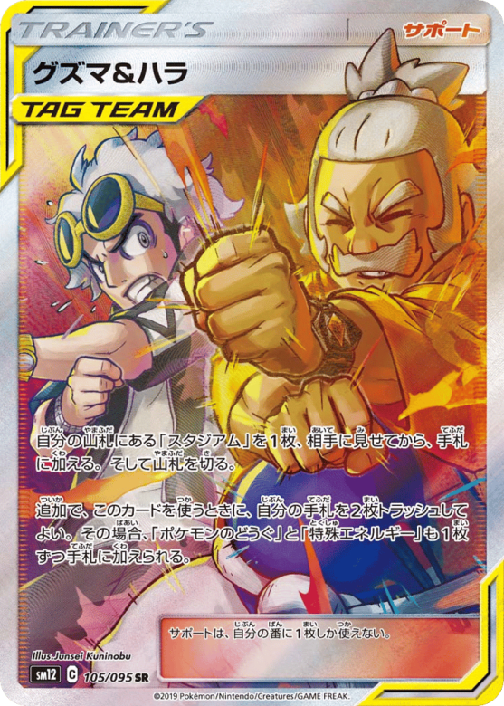 自分の山札にある「スタジアム」を1枚、相手に見せてから、手札に加える。そして山札を切る。 追加で、このカードを使うときに、自分の手札を2枚トラッシュしてよい。その場合、「ポケモンのどうぐ」と「特殊エネルギー」も1枚ずつ手札に加えられる。 サポートは、自分の番に1枚しか使えない。