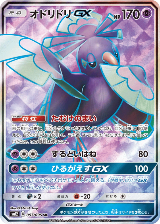 前の相手の番に、自分のポケモンがきぜつしていたなら、自分の番に1回使える。自分の山札を3枚引く。この番、すでに別の「たむけのまい」を使っていたなら、この特性は使えない。
