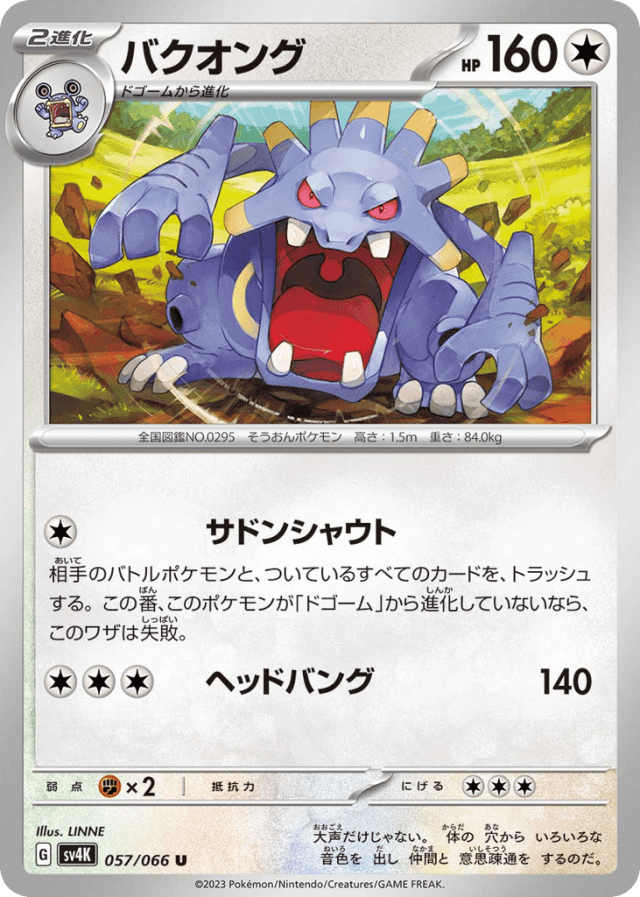 相手のバトルポケモンと、ついているすべてのカードを、トラッシュする。この番、このポケモンが「ドゴーム」から進化していないなら、このワザは失敗。