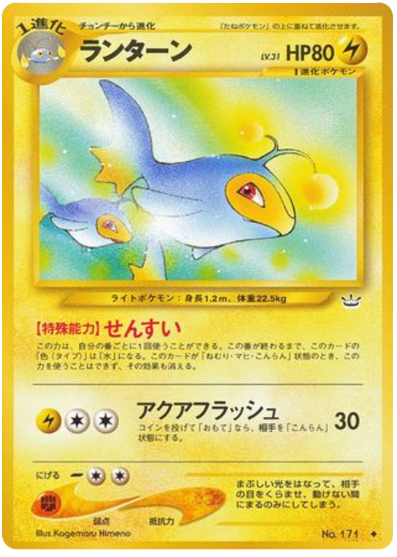 Once during your turn (before your attack), you may change Lanturn's type to Water until the end of your turn. This power can't be used if Lanturn is Asleep, Confused, or Paralyzed. If Lanturn becomes Asleep, Confused, or Paralyzed after you have used this power, its type changes back to Lightning.