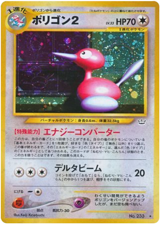 Once during your turn (before your attack), you may choose 1 basic Energy card attached to 1 of your Pokémon and choose an Energy type. Treat that Energy card as that type until the end is your turn. This power can't be used if Porygon2 is Asleep, Confused, or Paralyzed. If Porygon2 becomes Asleep, Confused, or Paralyzed, the Energy card goes back to its original type.