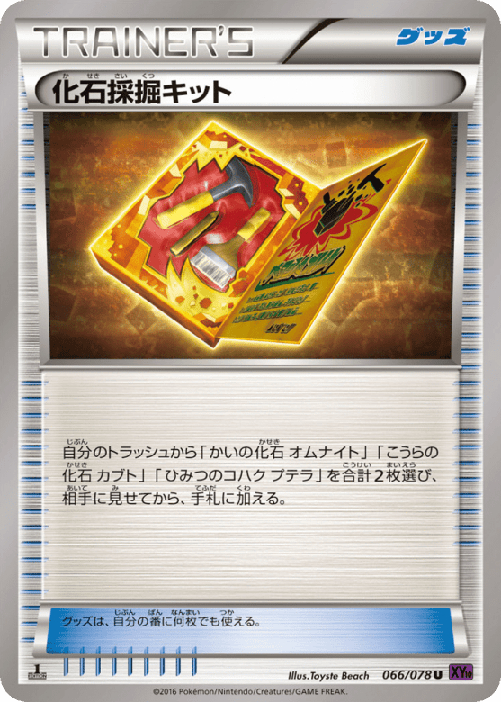 自分のトラッシュから「かいの化石 オムナイト」「こうらの化石 カブト」「ひみつのコハク プテラ」を合計2枚選び、相手に見せてから、手札に加える。 グッズは、自分の番に何枚でも使える。