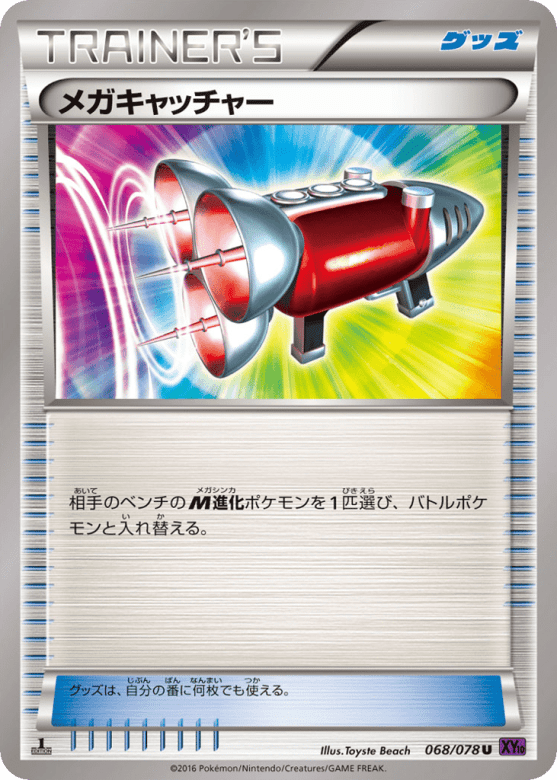 相手のベンチのM進化ポケモンを1匹選び、バトルポケモンと入れ替える。 グッズは、自分の番に何枚でも使える。