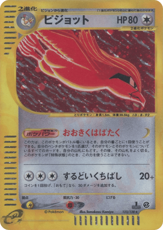 Once during your turn (before your attack), if Pidgeot is your Active Pokémon, you may shuffle 1 of your Benched Pokémon and all cards attached to it into your deck. This power can't be used if Pidgeot is affected by a Special Condition.