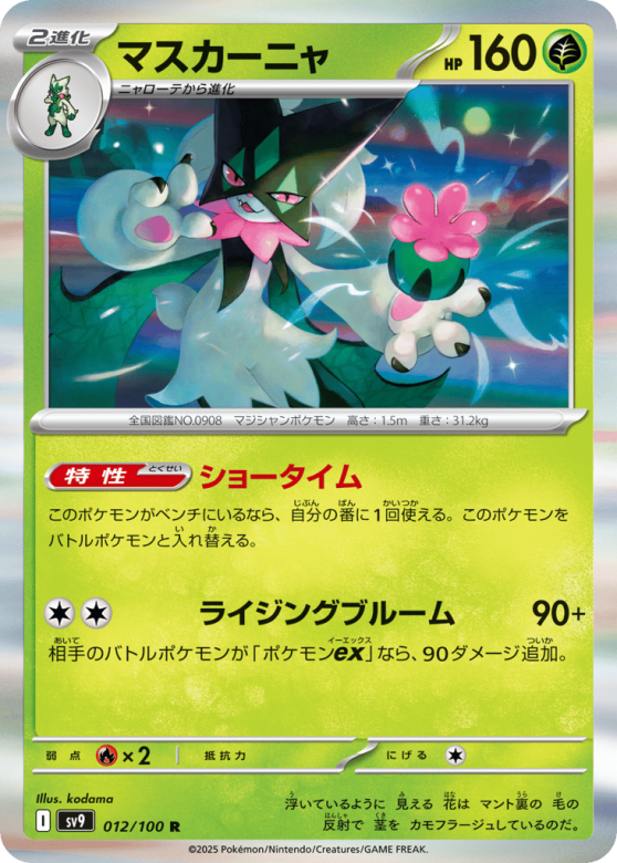 浮いているように 見える 花は マント裏の 毛の 反射で 茎を カモフラージュしているのだ。 (This Pokémon uses the reflective fur lining its cape to camouflage the stem of its flower, creating the illusion that the flower is floating.)