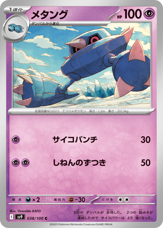 2匹の ダンバルが 合体した。 2つの 脳みそが 連結したので サイコパワーは より 強くなった。 (It is formed by two Beldum joining together. Its two brains are linked, amplifying its psychic power.)