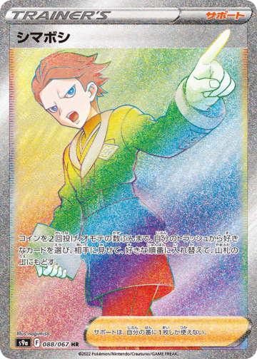 コインを2回投げ、オモテの数ぶんまで、自分のトラッシュから好きなカードを選び、相手に見せて、好きな順番に入れ替えて、山札の上にもどす。 サポートは、自分の番に1枚しか使えない。